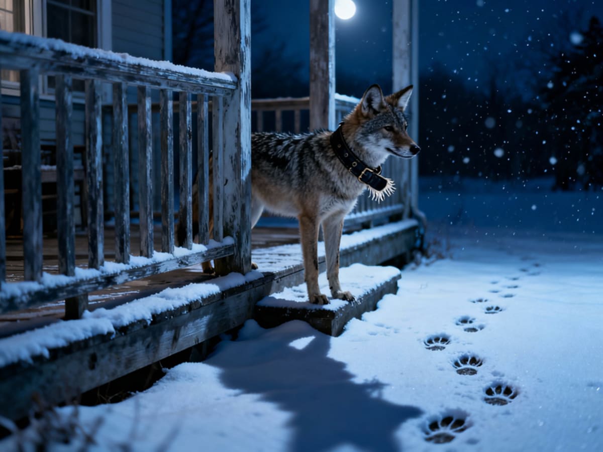 She opened the door with her flashlight trembling in her hand. A coyote stood at the edge of the porch, snow catching in its thick fur. Its eyes shone amber, calm but heavy with knowing. Beneath its jaw hung a black leather collar, cracked and stiff with age.