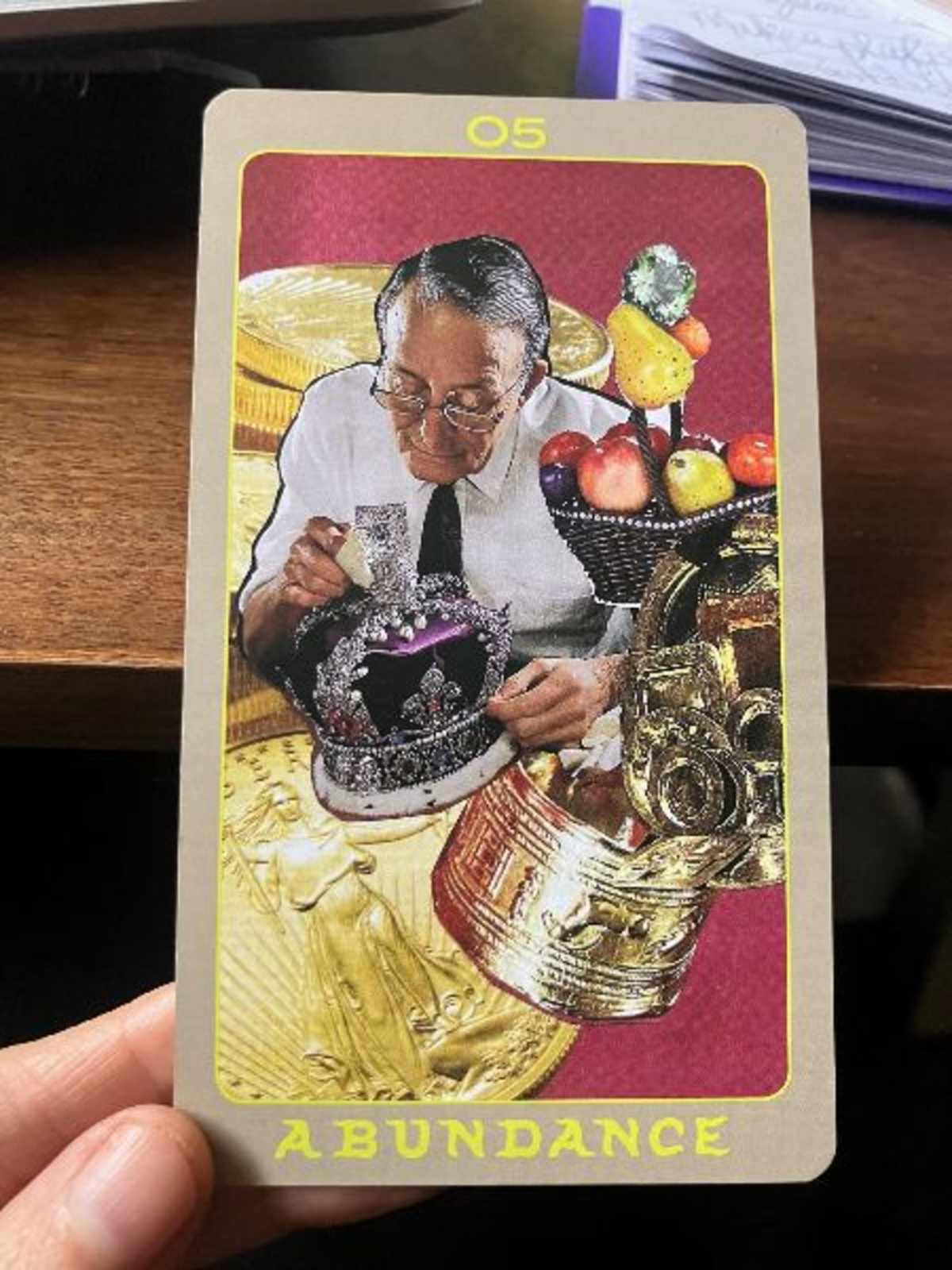 She finds the card tucked under the edge of a dusty ledger in her grandfather’s office, a collage of gold and fruit gleaming against a velvet background. In the image, a man sits surrounded by riches. A crown between his hands, tin cans transmogrified into sumptuous vessels, apples polished to an unnatural sheen. There is a face, but no name; only the suggestion of hunger quelled.