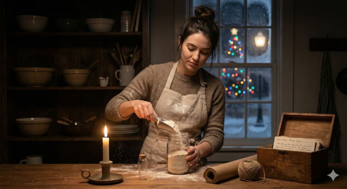 Flour first. She held the measuring cup in both hands and thought about Winterbound's message. The kind of nights where you forget what your mom's kitchen smells like. She poured the flour slowly, watching it settle into soft white drifts at the bottom of the jar, and she let herself remember her own mother's kitchen on the Christmas Eve when the gingerbread house arrived. The way grief had made everything gray and muted until that box appeared on the porch, until the smell of spices filled the house, and her mother had smiled for the first time in weeks.
